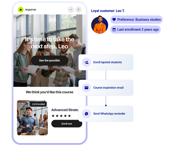 Connect your vast tech stack to create a single, comprehensive view of your student journey. With enriched and unified data at your fingertips, you can gain deeper insights into student needs, preferences, and behaviors. Drive personalized journeys of discovery with enriching educational content that engages students, alumni, learners, and academics.